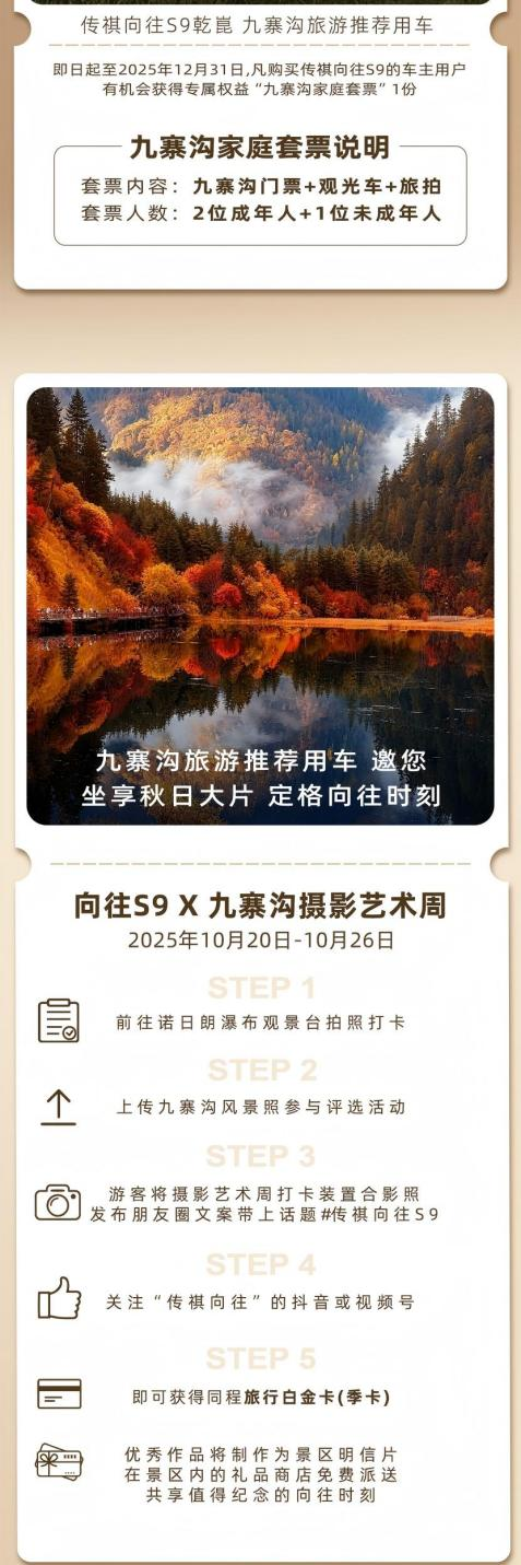 10月20-26日,九寨沟摄影艺术周期间,前往诺日朗瀑布观景台拍照打卡,并带上话题#传祺向往S9分享九寨沟风景照,有机会获得同程旅行白金卡(季卡)。不仅如此,即日起至12月31日,购买向往S9的车主并在同程旅行APP首页搜索栏输入“传祺向往S9”进入活动页面参与活动,还有机会获得专属权益——“九寨沟家庭套票”,共赏九寨沟秋日绚烂美景,奔赴向往的幸福生活。